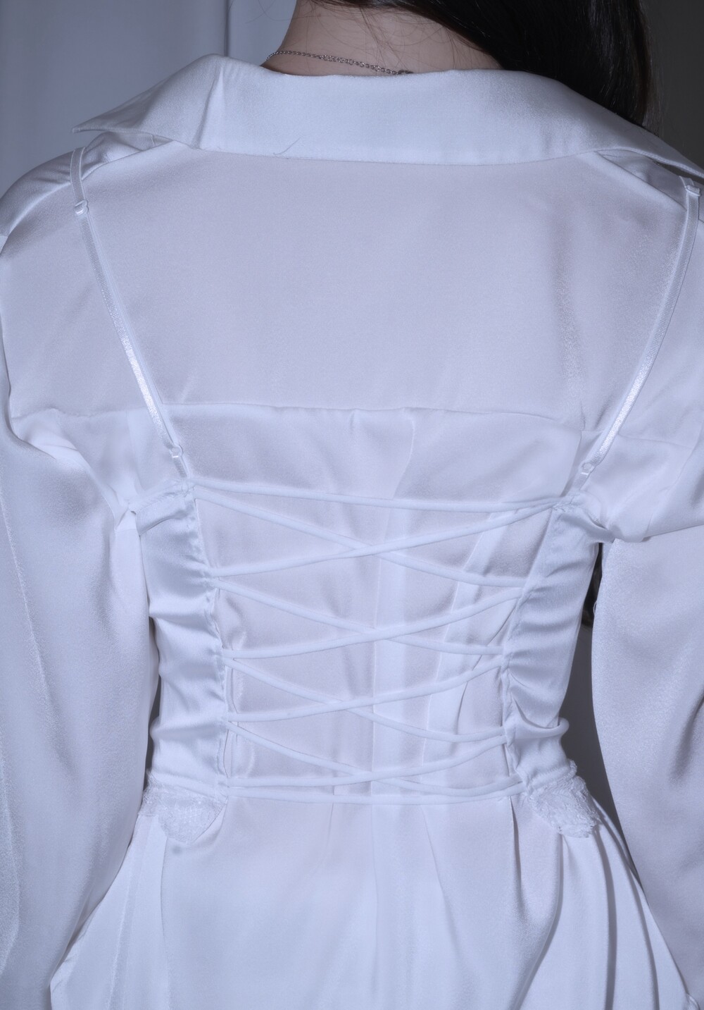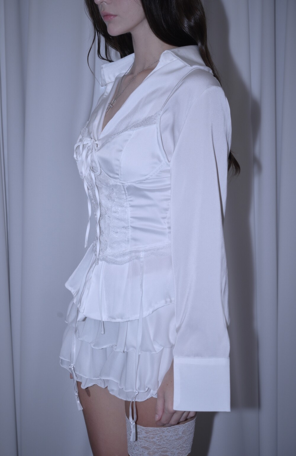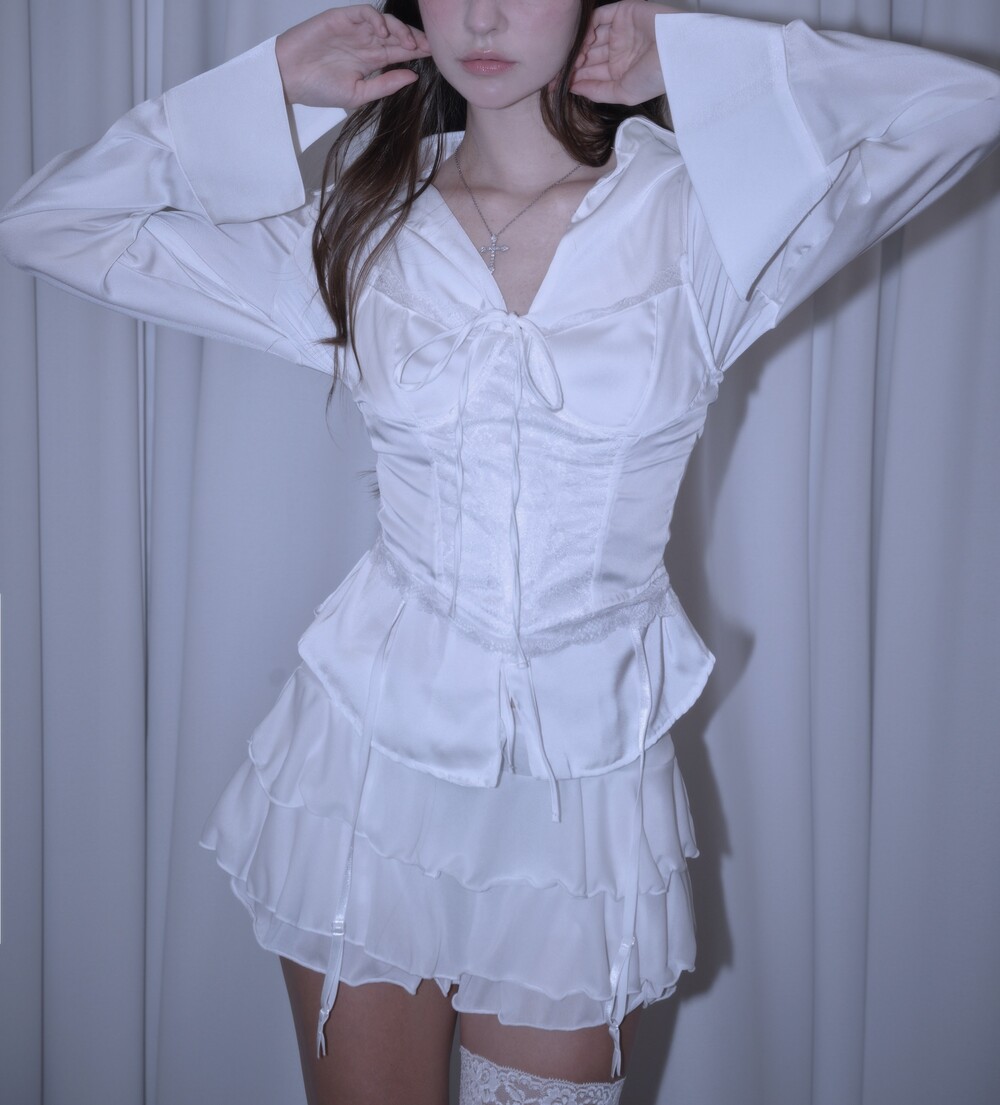* 은은한 새틴 원단의 블라우스와 레이스 뷔스티에의 세트 제품입니다.